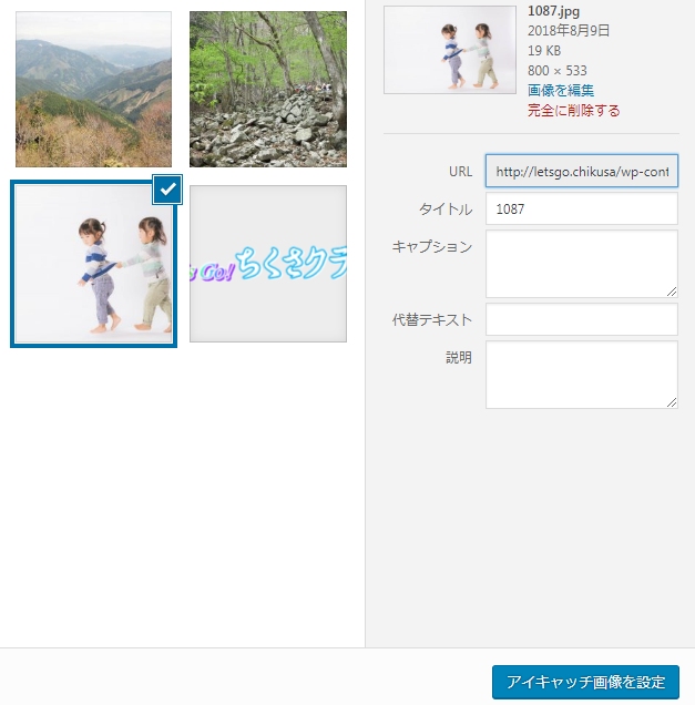すでにアップロード された画像を挿入するには 投稿の編集画面で ↓ 画像を選んで 中央に中サイズ、拡大効果 ON状態で貼...