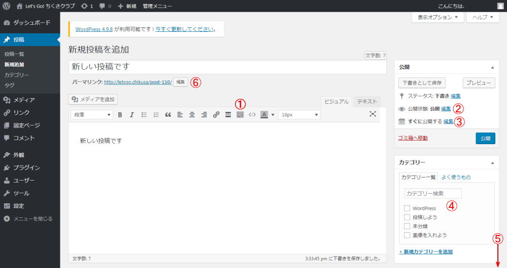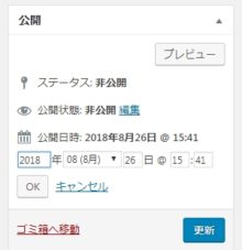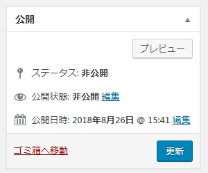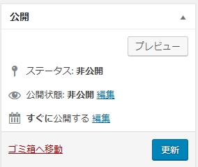 非公開を選ぶと「下書きとして保存」が消えて、「公開」も「更新」に変わりました。これで「下書き状態として保存」されるので完成まで安心して「更新」ボタンを押せます。